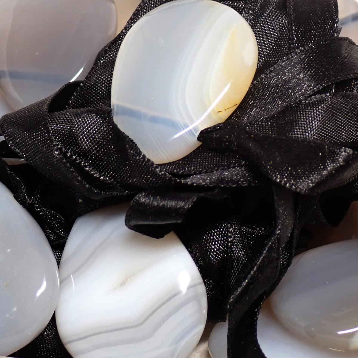 L'agate (SiO2) fait partie de la famille des calcédoines, qui sont à leur tour des variétés micro-cristallines de quartz. Elle est la gemme de la Terre, qui nous relie à sa force et à sa beauté. Son nom évoque un mot grec désignant "ce qui est beau et bon". L'agate représente la vie matérielle dans son aspect positif. Pierre d'ancrage, elle apporte stabilité. Son action étant lente, il convient de la porter pendant de longues périodes.