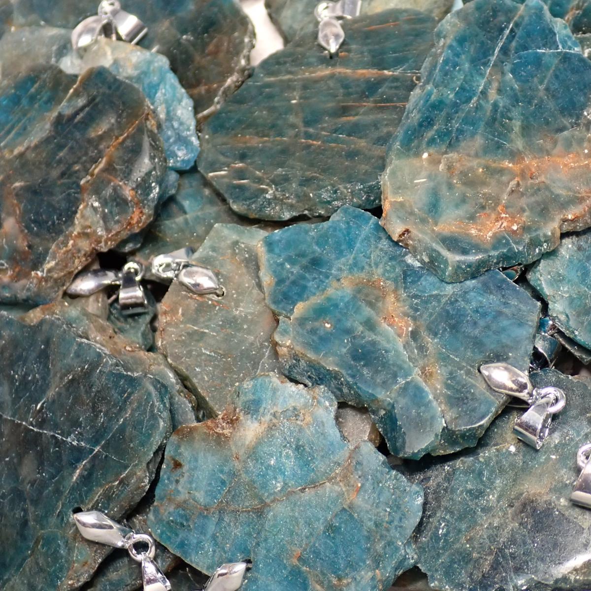 Phosphate de calcium avec fluor et chlore. Excellente sur le chakra de la gorge, en pendentif ou en collier, elle oblige à dire ce que nous retenons, c'est la pierre de la verbalisation et de la libre expression. Porter en bracelet du côté droit ou en collier pour faire sortir nos mauvaises émotions. Nous conseillons son utilisation sur la gorge pour combattre la timidité et le refus de parler. Avec la calcédoine bleue, elle apaise progressivement la colère ; avec la turquoise, elle favorise une meilleure expression (verbalisation) des sentiments. Pierre fragile qui ne supporte que l'eau de source et le sel sec.