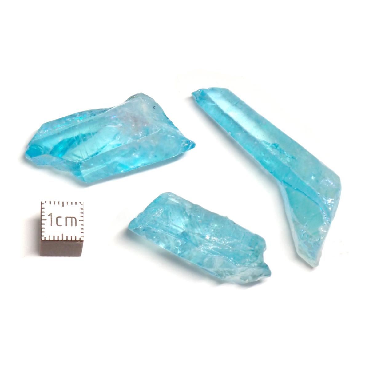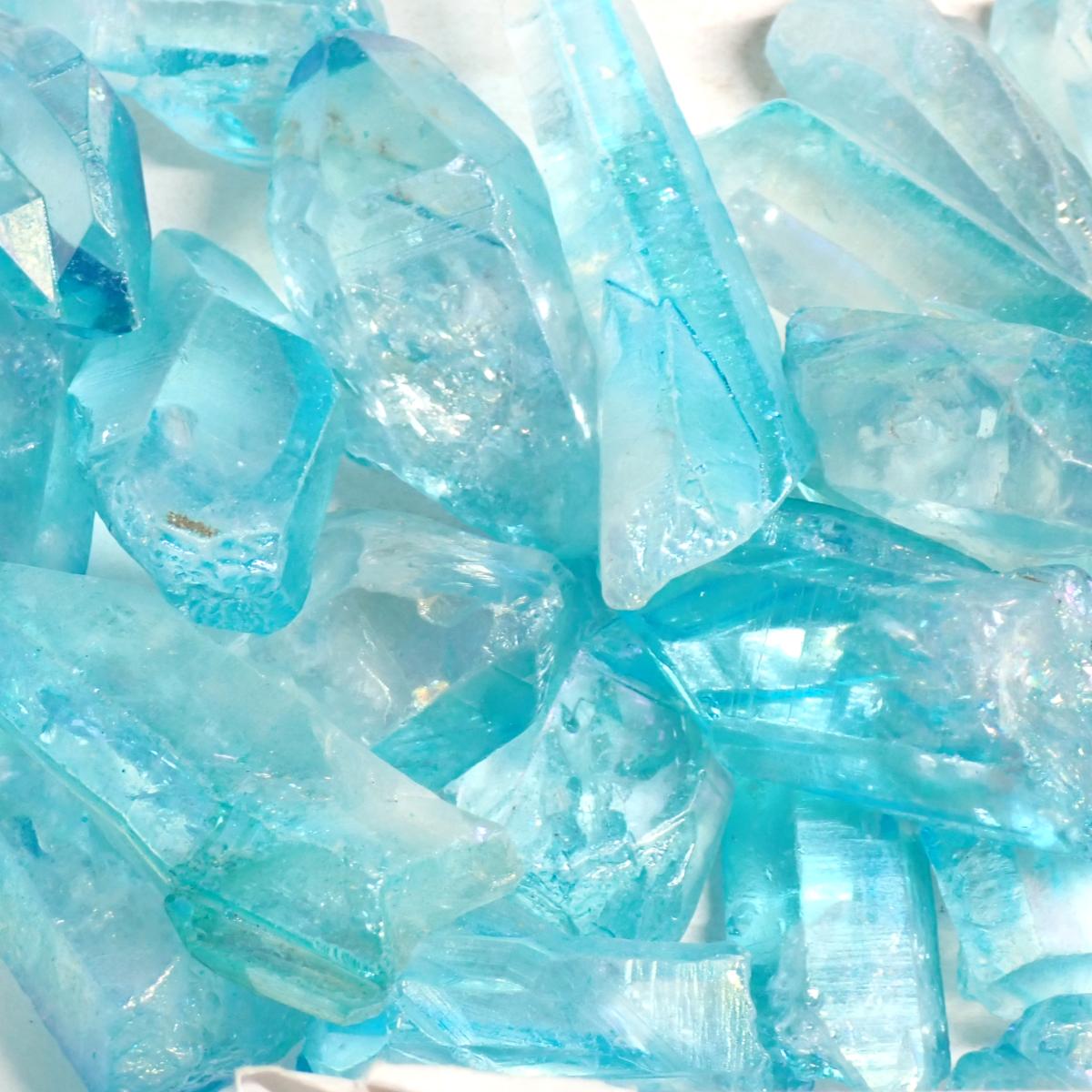Sa teinte bleue irisée est obtenue en pulvérisant de l'or sur le cristal brut dans un environnement chaud. Ainsi enrichi, le quartz acquiert les propriétés de l'or, générant une énergie très intense. Il stimule tous les chakras, purifie les corps énergétiques et libère de toute forme de négativité.