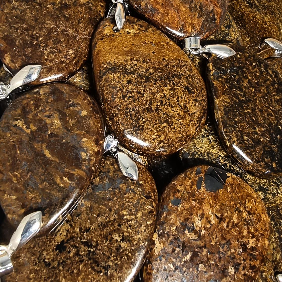 Silicate de fer et de magnésium, de la famille des pyroxènes (Na Fe Si2 O6). Même composition chimique que l'HYPERSTHENE, mais à la différence de celui-ci, les cristaux de la bronzite sont courts et irréguliers. Sur le 3ème chakra, plexus solaire elle rééquilibre en douceur cette zone ; sur le chakra du coeur elle nous inspire tendresse et bien-être.