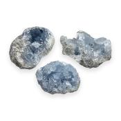 Ou célestite. Sulfate de strontium. Réequilibre le 5ème chakra centre énergétique laryngé. Les géodes en célestine élèvent le taux vibratoire des lieux. Elles apportent une ambiance harmonieuse et calme ; elle conseillée dans une chambre à coucher.