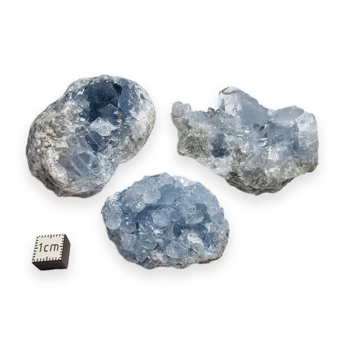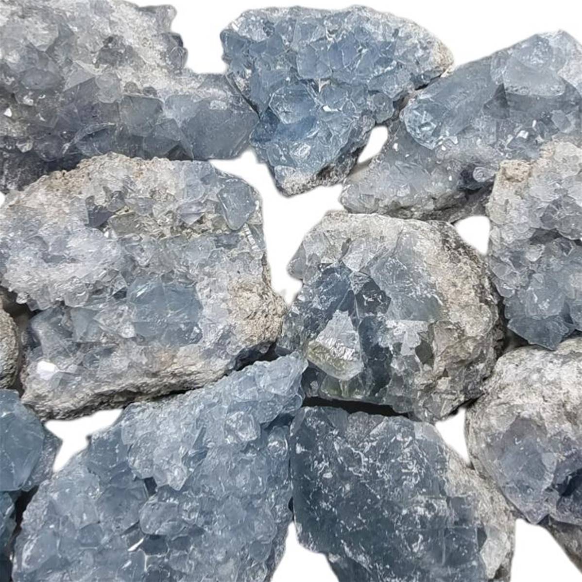 Ou célestite. Sulfate de strontium. Réequilibre le 5ème chakra centre énergétique laryngé. Les géodes en célestine élèvent le taux vibratoire