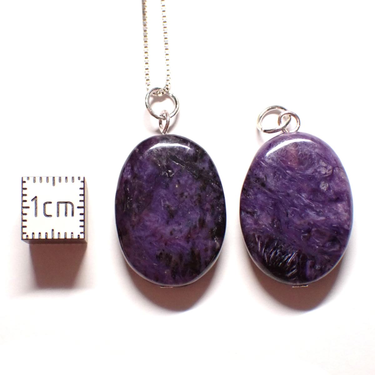 Silicate hydraté de potassium, sodium et calcium. Comme l'améthyste, la charoïte est une pierre spirituelle, qui descend dans le corps physique jusqu'au sang pour donner la conscience de sa mission et apporter de l'aide à sa réalisation. Elle est associée au 7ème chakra coronal et au 1er chakra entre les jambes.