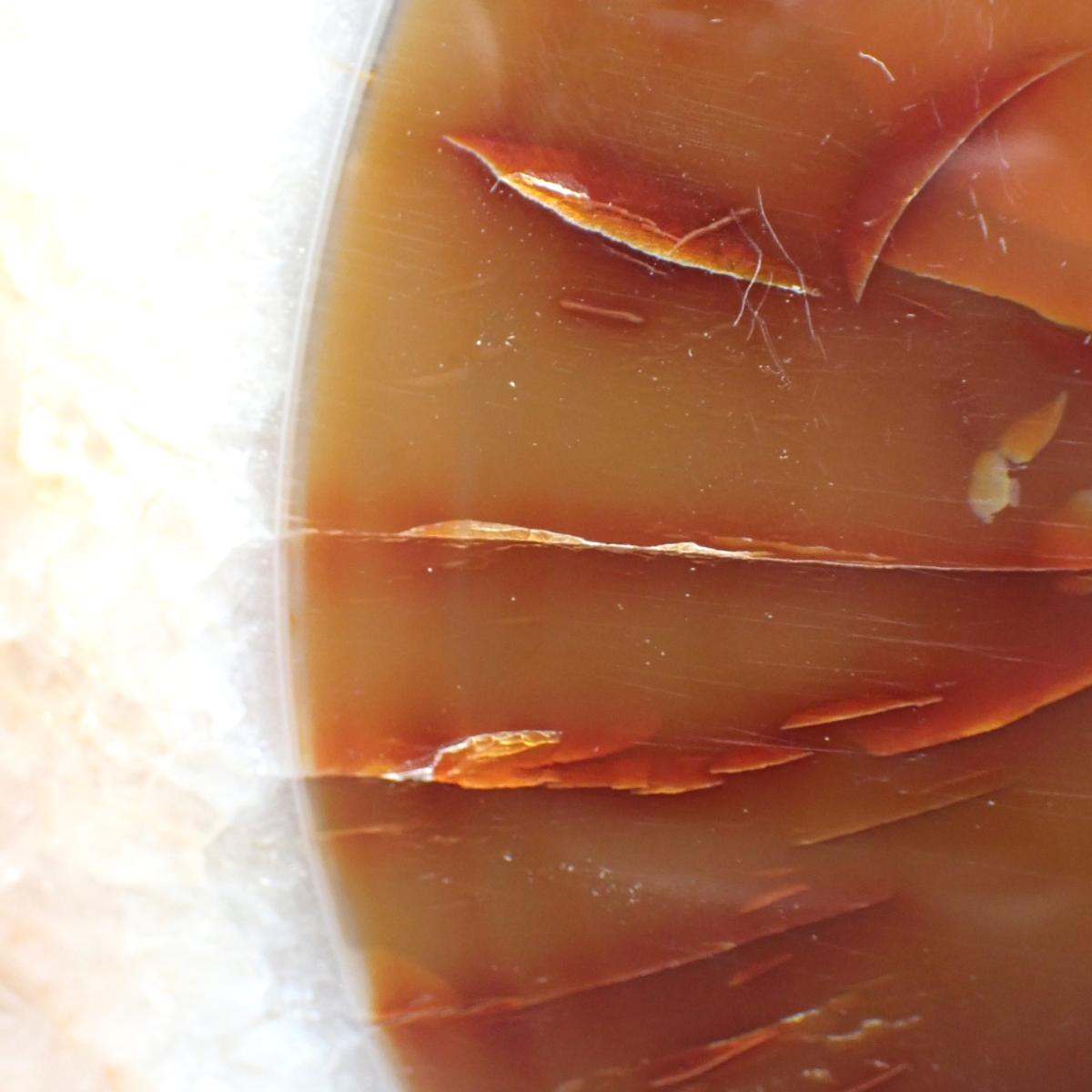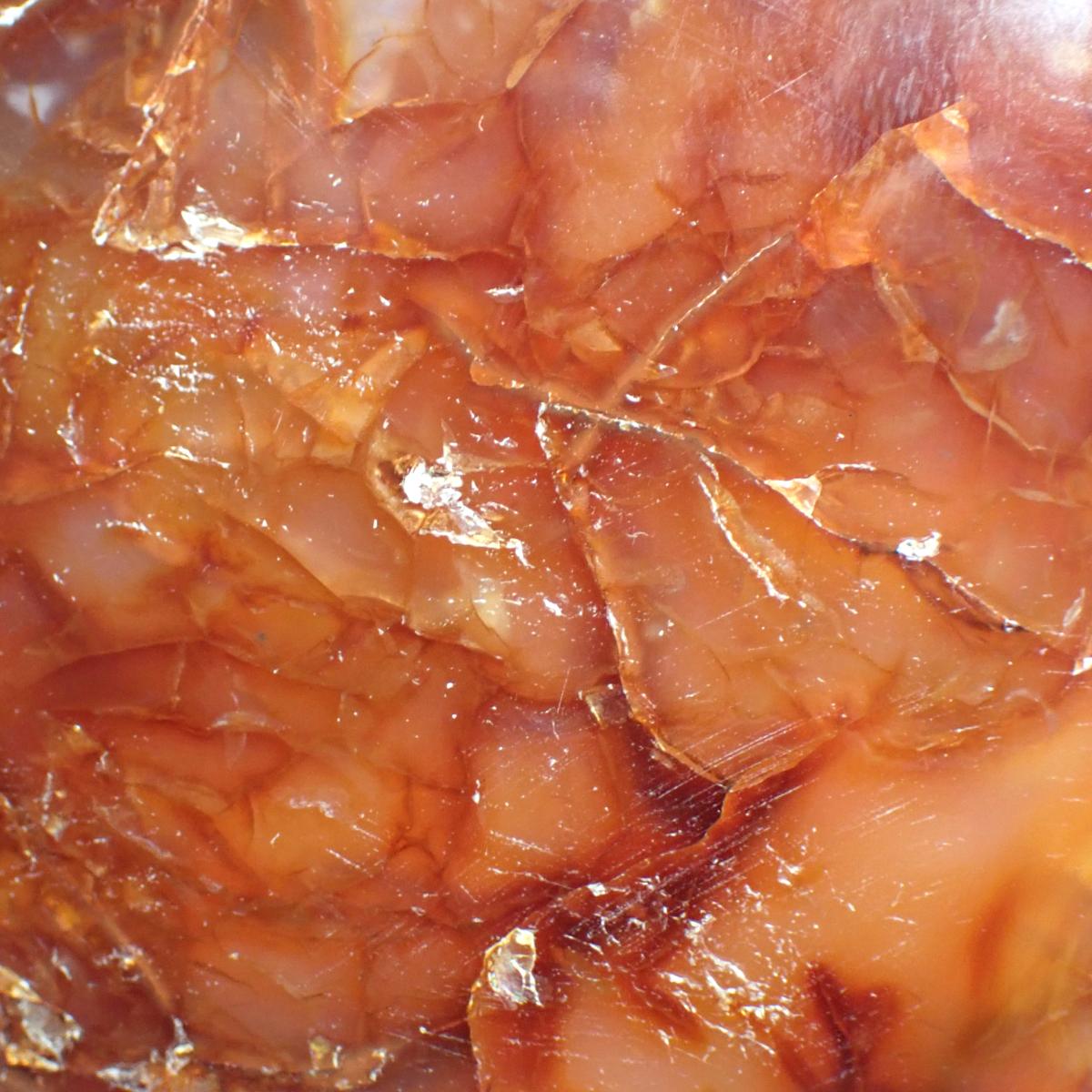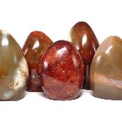 Variété de calcédoine, au même titre que l'agate (groupe du quartz, Si O2). Sa couleur, disposée en bandes concentriques, varie entre l'orange clair et le rouge brique. Pierre de base du 2ème chakra sous le nombril, elle rend plus endurant, plus joyeux, plus solide , elle peut être portée près du cœur pour toute ces qualités.