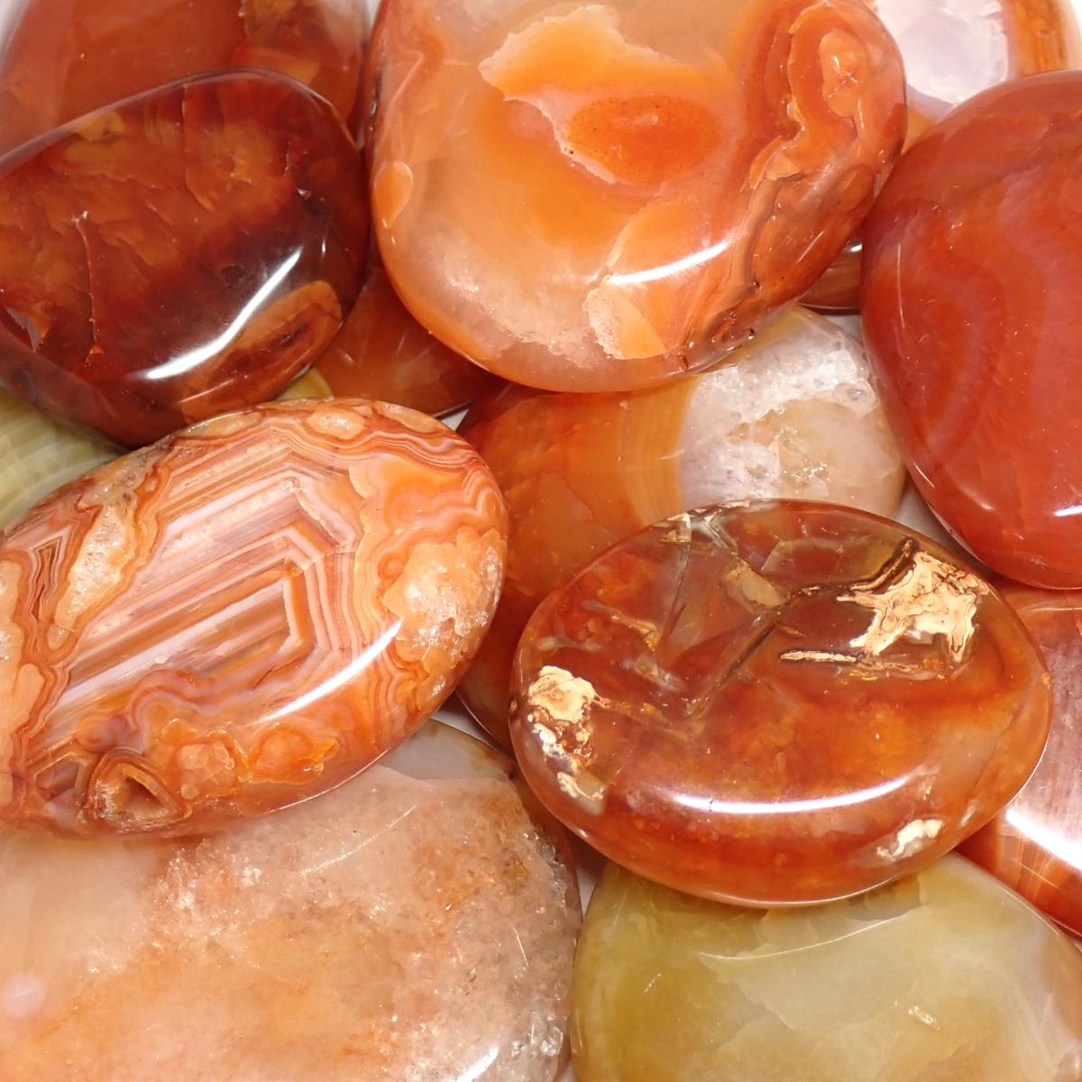 Variété de calcédoine, au même titre que l'agate (groupe du quartz, Si O2). Sa couleur, disposée en bandes concentriques, varie entre l'orange clair et le rouge brique. Pierre de base du 2ème chakra sous le nombril, elle rend plus endurant, plus joyeux, plus solide , elle peut être portée près du cœur pour toute ces qualités.