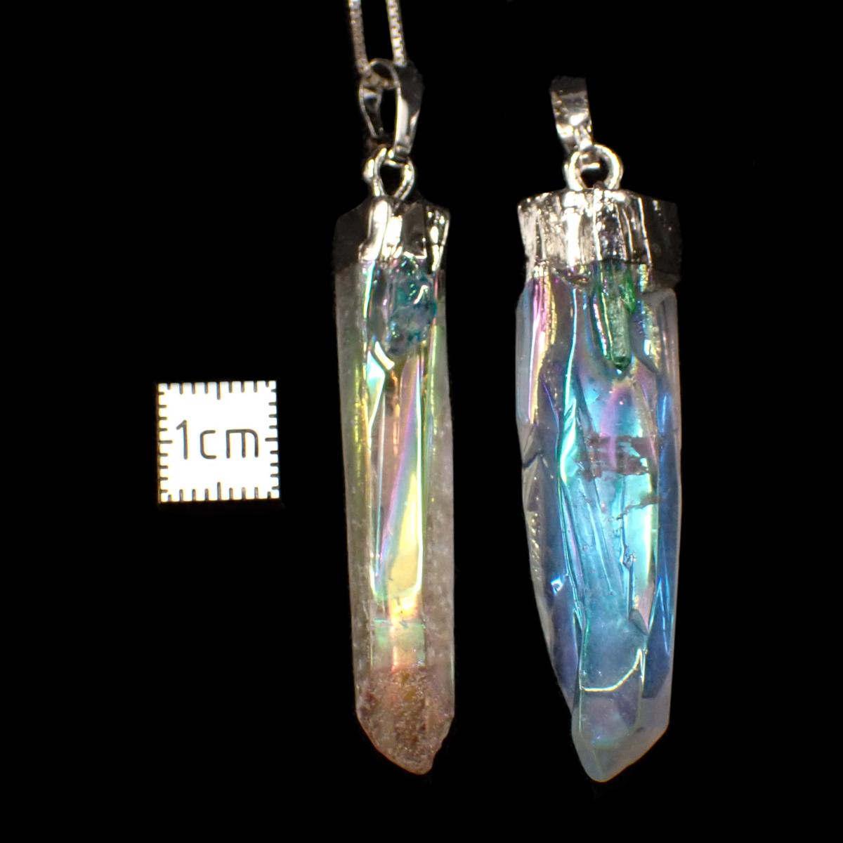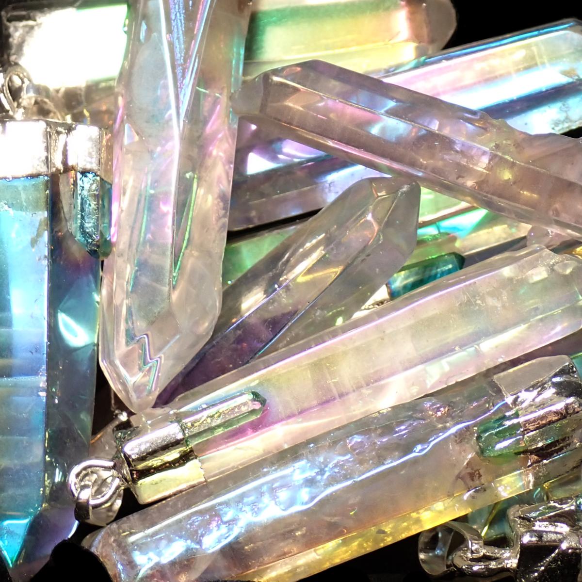 Cristal très transparent, irisé par une pulvérisation de platine. Appelé aussi cristal des anges. Bien que colorié artificiellement, ce cristal agit partout en nous grâce à son énergie et sa couleur, comme la chromothérapie, utile spécialement pour la lumière énergétique que contient notre corps, pour les chakras, pour le plan émotionnel, pour chasser nos émotions négatives et être comme un arc en ciel.