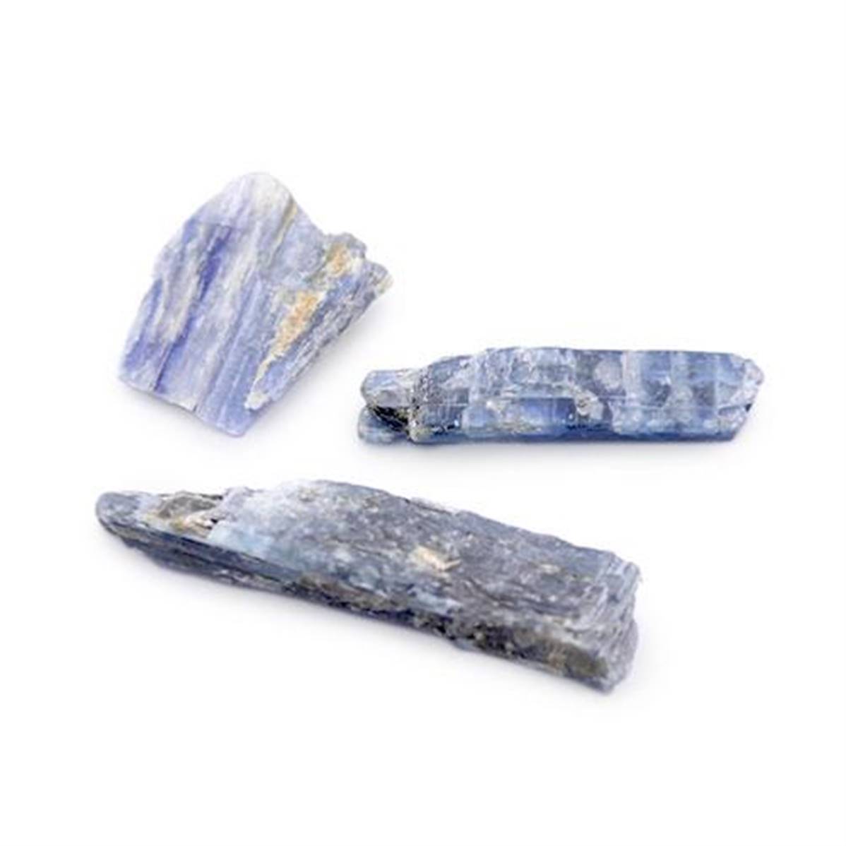 Silicate d'aluminium, également appelée DISTHENE. La variété plus claire, en provenance du Brésil, est un bon outil car elle favorise l'exploration du passé et l'acceptation de soi. C'est la pierre du « lâcher prise «. Elle est utilisée dans le voyage astral; conseillée la nuit pour ne pas trop penser. La variété foncée (avec des inclusions de biotite) en provenance du Zimbabwe est plus puissante. Elle travaille efficacement sur les problèmes inconscients et la peur de la mort.