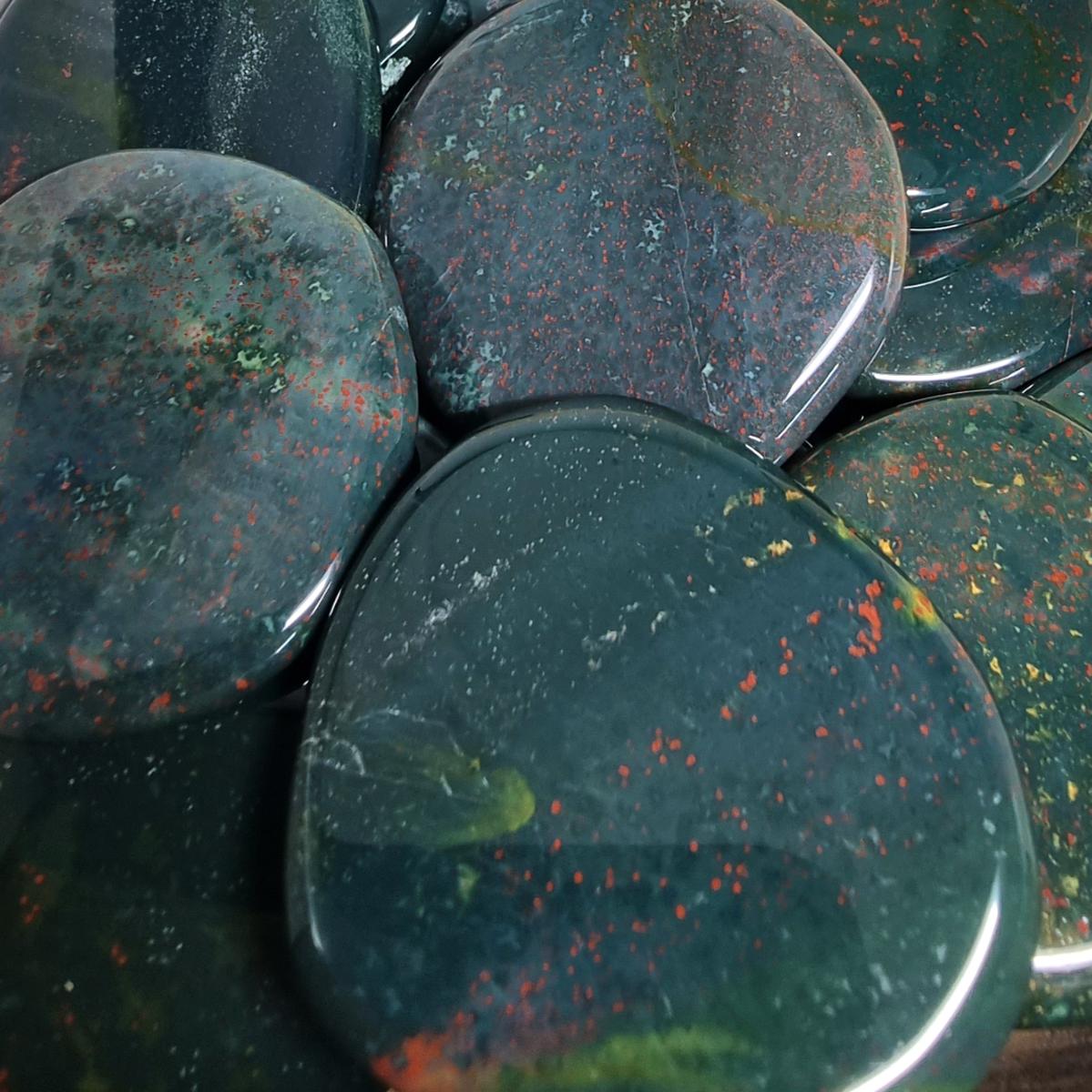 Aussi appelé  "jaspe sanguin", il est vert, tacheté de rouge (inclusions d'oxyde ferrique). L'héliotrope peut être un jaspe (opaque) ou une agate (translucide).  Il associe l'énergie purifiante du vert à la vitalité du rouge. Pierre dite de sang du Christ, le jaspe héliotrope dynamise spirituellement le sang. Pierre d'ancrage en douceur, elle nous inspire la stabilité et le courage. Sur le plan psychique elle peut nous aider à trouver notre voie.