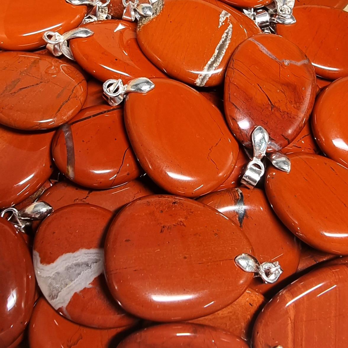Doit sa couleur à des dépôts d'oxyde ferrique. Le jaspe rouge, symbole de la renaissance, est une pierre d'action et d'initiative, idéale pour ceux qui concrétisent un projet. Il dynamise en douceur le chakra racine et sacré en leur apportant une nouvelle jeunesse. Sur le plan psychique, il nous réconforte dans les situations difficiles. Pierre d'ancrage.