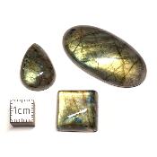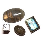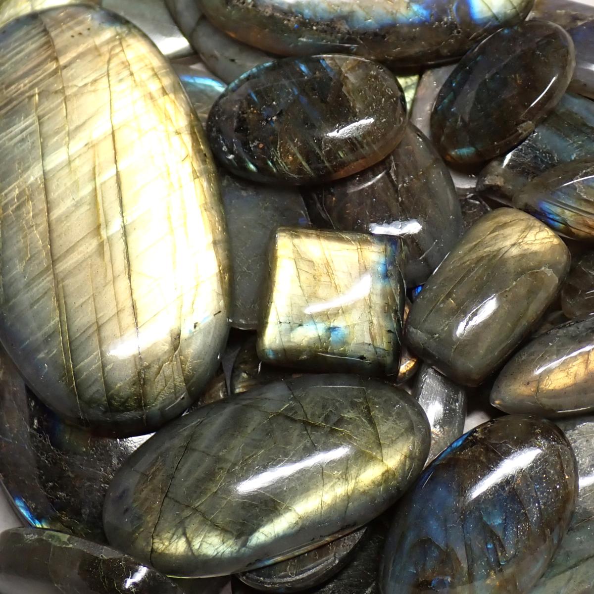 Feldspath (aluminosilicate de calcium). Pierre joliement colorée, très agréable, elle agit comme une douche lumineuse destressante, elle fonctionne comme un bouclier qui transforme les énergies négatives, les maux et les charges d'autrui et qui préserve notre énergie de ceux qui pourraient nous la "pomper". Avant de pratiquer un soin placer un galet de labradorite dans chaque main pour ouvrir et charger les chakras des mains. Nettoyage fréquent indispensable.