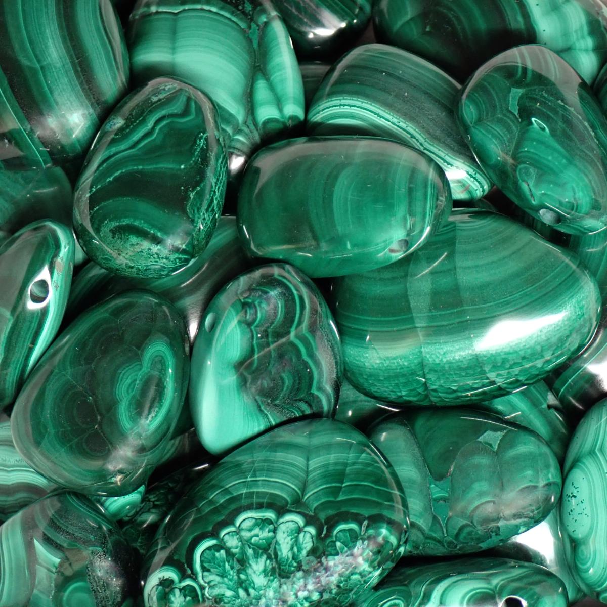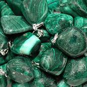 Carbonate basique de cuivre. Puissante, dense et opaque, elle absorbe l'énergie négative ; elle peut être appliquée sur les endroits du corps remplis d'énergie négative , elle active et fait tourner le chakra du cœur . sur le plexus solaire, elle évacue les tensions du diaphragme. Nettoyer fréquemment.