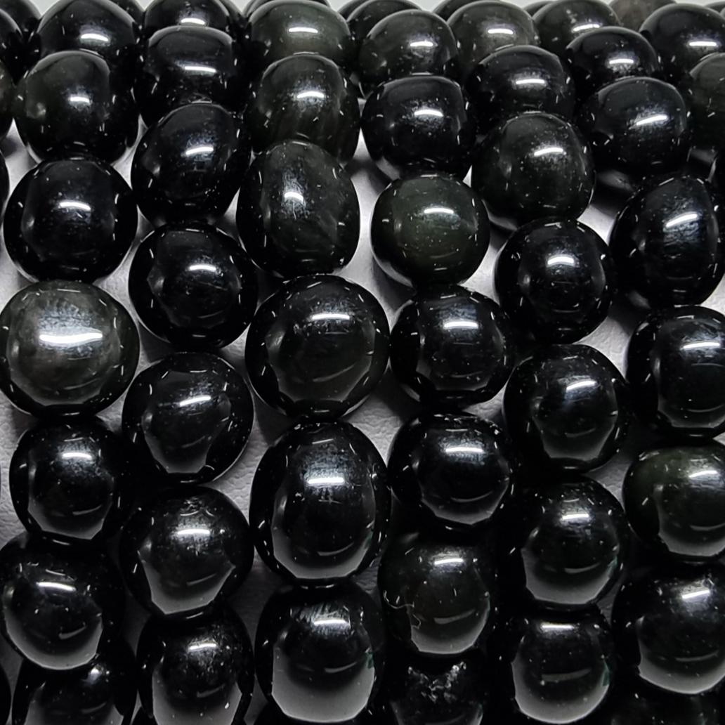Irisée de zones violacées, concentriques. Comme l'obsidienne noire, mais à un degré supérieur, elle nous protège efficacement, grande pierre de protection, placer dans une pièce près de soi, et associer à d'autres pierres de protections (Spinelle, Oeil de Tigre, Tourmaline Noire) lorsqu'on la porte sur soi. Cette puissante pierre de protection nous connecte aussi à notre inconscient, elle permet de l'apercevoir, de le ressentir et surtout fait circuler ces émotions que nous n'arrivons pas à changer. Certaines personnes la trouvent trop forte dans son travail de dégagement des émotions, d'autres personnes l'adorent et trouvent qu'elle ouvre des portes dans leur vie. Penser à toujours bien la purifier après usage. Taillée en boule et associée à une pointe en cristal de roche, elle transmute en lumière toutes le énergies négatives, elle évacue toutes les "entités", en alignant et en purifiant tous les chakras. Pierre de grandes possibilités, elle doit être utilisée avec respect. On lui attribue le pouvoir de repousser les attaques psychiques et occultes.