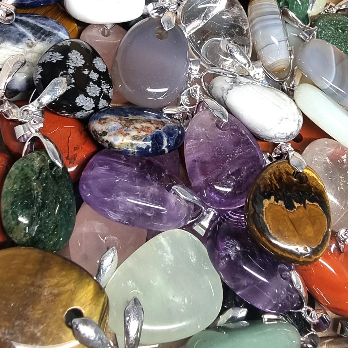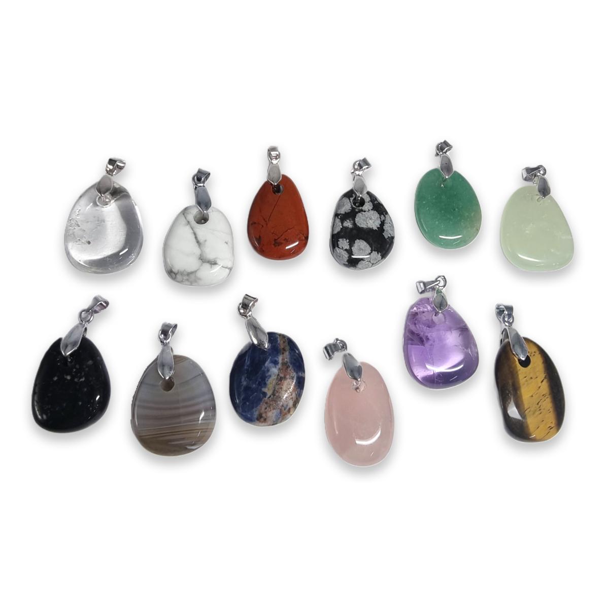 Agate naturelle 10pcs -Améthyste 5pcs - Aventure verte 3pcs -Cristal de Roche 5pcs -Howlite 5pcs - Fuchsite 5pcs - Jade de Chine 7pcs - Jaspe Rouge 5pcs - Obsidienne Neige 5pcs - Oeil de Tigre 5pcs - Quartz Rose 7pcs - Sodalite 5pcs - Tourmaline noire 3pcs