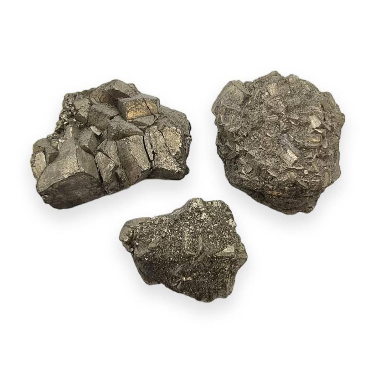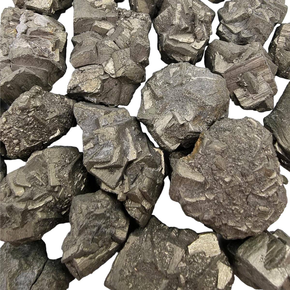 Sulfure de fer (Fe S2). La pyrite est un outil hors pair pour rétablir les polarités du corps physique. Elle est associée à la restructuration du mental. Elle stimulerait les facultés intellectuelles, la pensée rationnelle. Concerne l'organisation, l'ordre, la structure, les chiffres. Pierre des bâtisseurs et des architectes.