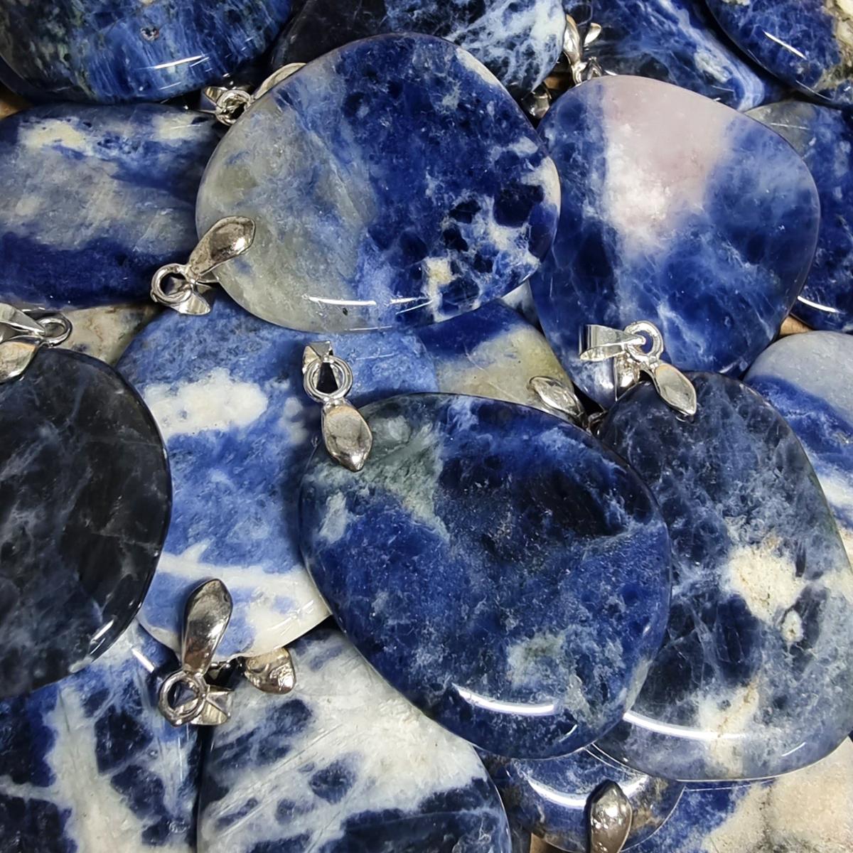 Aluminosilicate de sodium et de chlore. Tout comme le Lapis Lazuli, posée sur le chakra frontal, la sodalite est un bon stimulant du 3e oeil, un bon stimulant des fonctions cérébrales, de l'intelligence intuitive. Elle favorise la vision intérieure, clarifie le mental. Lorsque le mental est purifié et pacifié, nous accédons à une meilleure compréhension du monde et de nous mêmes. En méditation, la sodalite nous aide ainsi à nous détacher de vieux schémas mentaux. La sodalite apaisante de transformation en association avec l'aventurine verte et le jaspe mokaite.