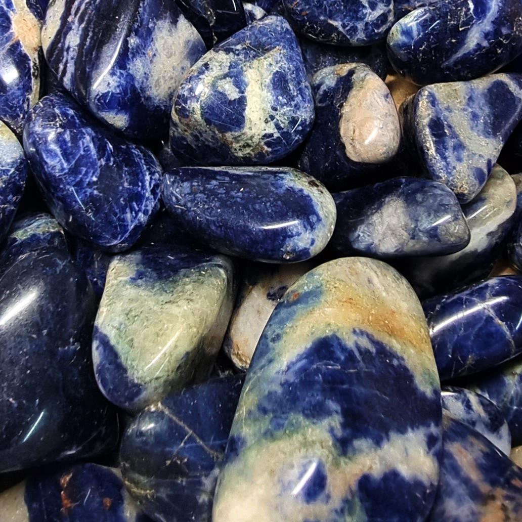 Aluminosilicate de sodium et de chlore. Tout comme le Lapis Lazuli, posée sur le chakra frontal, la sodalite est un bon stimulant du 3e oeil, un bon stimulant des fonctions cérébrales, de l'intelligence intuitive. Elle favorise la vision intérieure, clarifie le mental. Lorsque le mental est purifié et pacifié, nous accédons à une meilleure compréhension du monde et de nous mêmes. En méditation, la sodalite nous aide ainsi à nous détacher de vieux schémas mentaux. La sodalite apaisante de transformation en association avec l'aventurine verte et le jaspe mokaite.